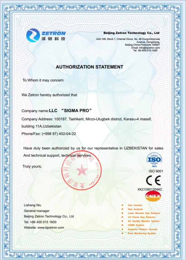 Мы рады сообщить о важном этапе в развитии нашей компании. LLC «SIGMA PRO» официально получила статус авторизованного партнера и представителя ведущего мирового производителя систем газового анализа — Beijing Zetron Technology Co., Ltd в Республике Узбекистан.